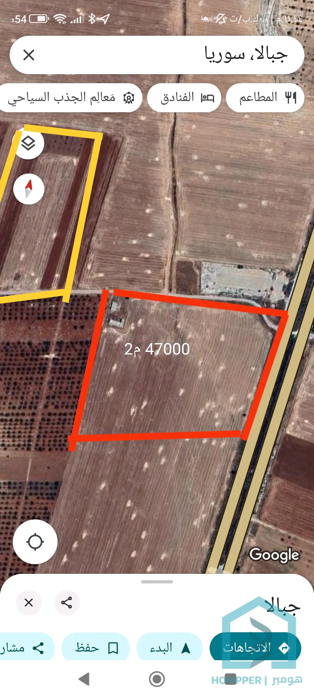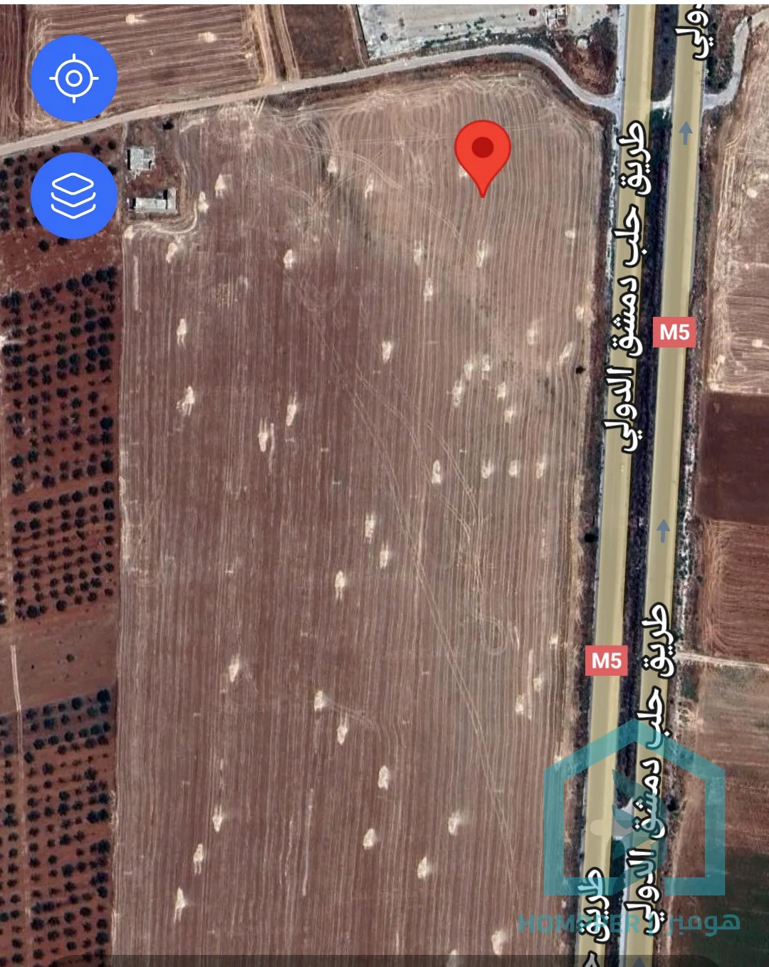 ارض بمساحة 47210 م2 تصلح لمنشأة تجارية او صناعية او سياحية او زراعية واجهتها الرئيسة على اوتوستراد حلب حماة الدولي بطول 234 م وواجهة ثانية على طريف فرعي من M4 بطول 238 م شكل مربع (زاوية بين طريقين) تحتوي على بناء بحاجة لترميم زبئر بحري مرخص