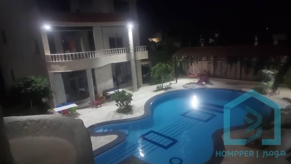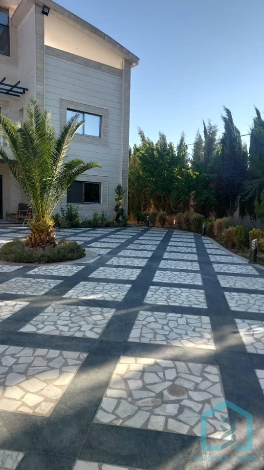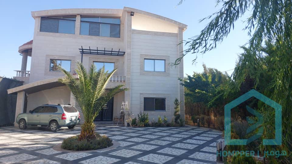 ڤيلا ملكية رقم 93 المنطقة : خان الشيح شارع جامع الرضا للبيع من المالك (مباشر) الملكية : حكم محكمة المساحة الاجمالية : 1250 متر دنم وربع مساحة البناء 400 متر ملبسح حجر طبيعي من جميع الجوانب الوصف : البناء مؤلف من طابق ارضي فيه غرفة نوم وصالون كبير مع واجهات سيكويت مطلة عالمسبح ومطبخ امريكي مفتوح عالصالون وحمام الطابق الثاني غرفة نوم عدد 3 مع صالون كبير ومطبخ وحمام وبرندات مطلة على المسبح وعلى مدخل الفيلا الطابق الثالث سويت مع حمام وتراس الكسوة : سوبر ديلوكس ملكي حديث الفيلا جديدة بالورق غير مستعملة رخام وحجر بازلت مسبح كبير مفلتر على شكل غيتار مع مسبح للاطفال خزان مياه ارضي وخزان على سطح الفيلا شلالات مياه عدد 3 في الفيلا بير ماء خاص بالفيلا غرفة للناطور باب خارجي غرفة معدات وكهرباء طاقة شمسية للماء الساخن طاقة شمسية مع بطارية ليثيوم لتشغيل كامل الفيلا اضاءة ليلية مميزة لكامل الفيلا تراس جانب المسبح جلسة قرميدية جانب المسبح اشجار مثمرة من جميع الاصناف اشجار سرو داير الفيلا باربكيو للشوي مطبخ خارجي لتخديم الجلسة الخارجية مشالح جانب المسبح مع حمامات