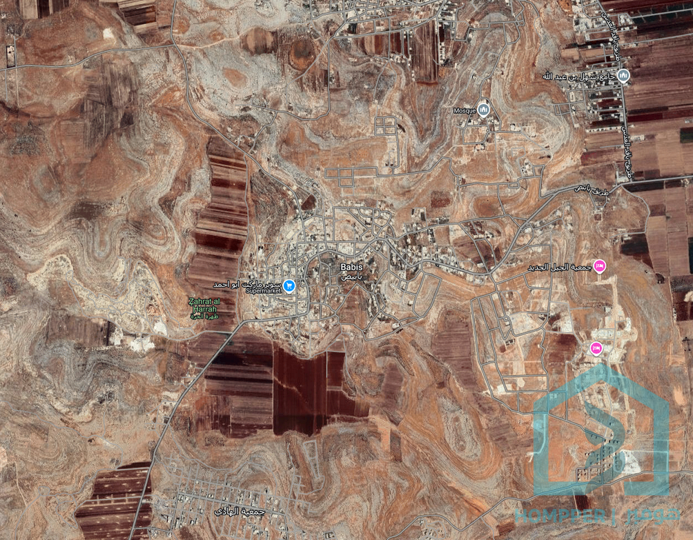 كود العرض 847M بريف حلب الغربي بمنطقة بابيص الارض خارج التنظيم المساحة 11104 متر طابو اخضر اسهم الارض واجهتا 200 متر وعرضا 85 متر تقريبا في طريق زفت واصل لعند الارض الارض صخرية ولا يوجد فيها شي غير مسورة